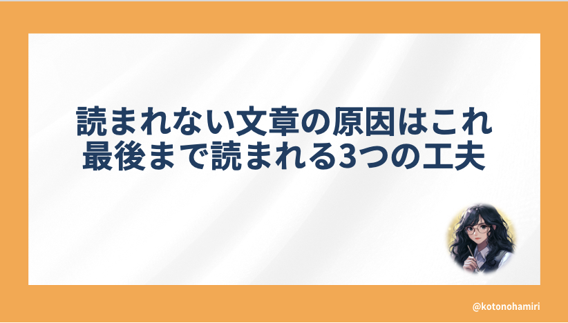読まれない文章の原因はこれ。最後まで読まれる3つの工夫 「一生懸命書いたのに、読まれていない」と感じていませんか?実は人は文章を最後まで読まず、最初と最後だけで判断しています。読まれない前提に立ち、スッと読まれる文章...